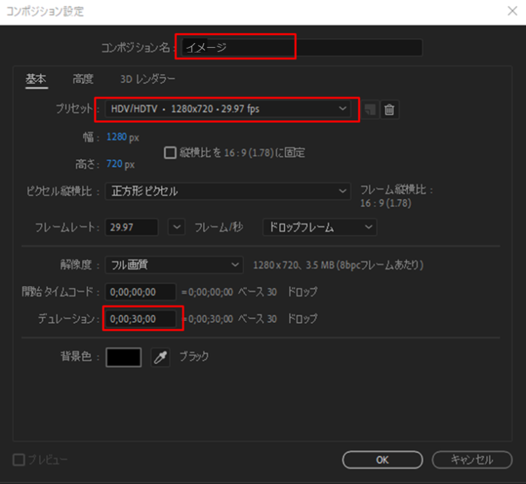 [プリセット]→今回はYouTubeの規格に合わせて[HDV/HDTV・1280×720・29.97fps]としました。