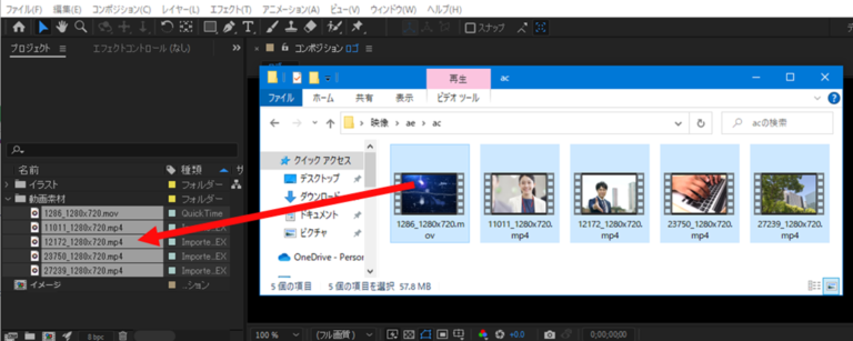 次に、準備した動画や画像をAfter Effectsに読み込みます。素材はメニューから読み込むこともできますし、ドラッグ&ドロップでも追加できます。