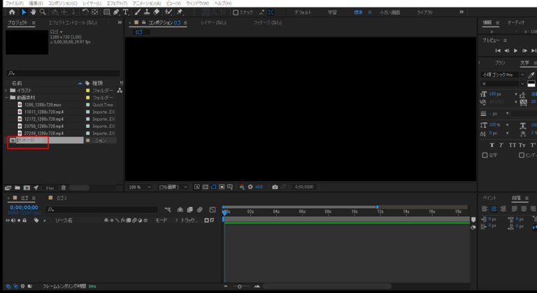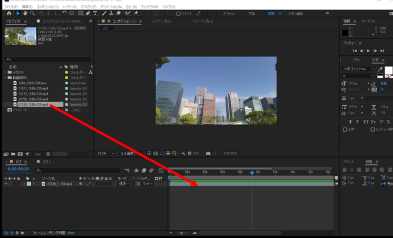 ⑤コンポジションのタイムラインに素材(フッテージ)を配置する