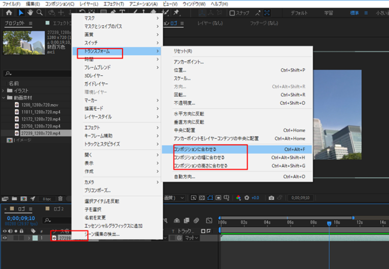 素材を右クリック→[トランスフォーム]→[コンポジションに合わせる・コンポジションにの幅に合わせる・コンポジションの高さに合わせる]