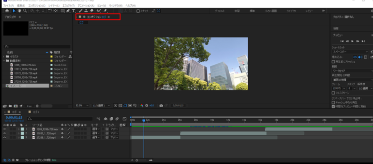 コンポジションを作ることで、そこに素材を配置して編集できるようになります。