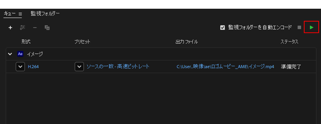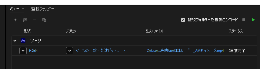 Adobe Media Encoderというソフトが立ち上がります。選択したコンポジションがキューとして追加されます。出力先の保存場所も設定します。
