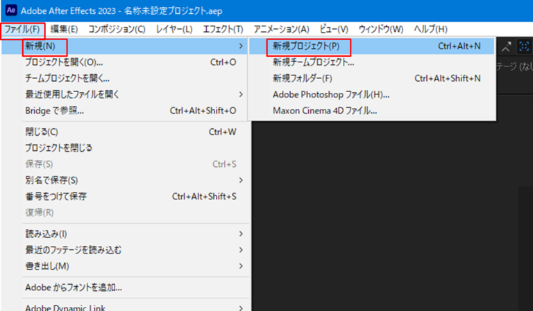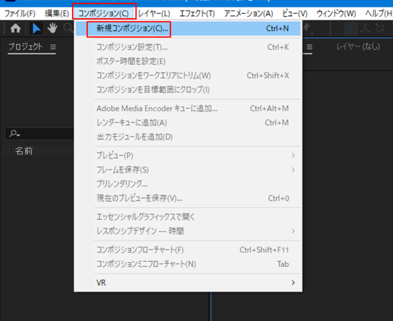 素材の準備ができたら、After Effectsで新しいプロジェクトを作成し、保存します。プロジェクトは編集内容全体をまとめて管理するファイルです。