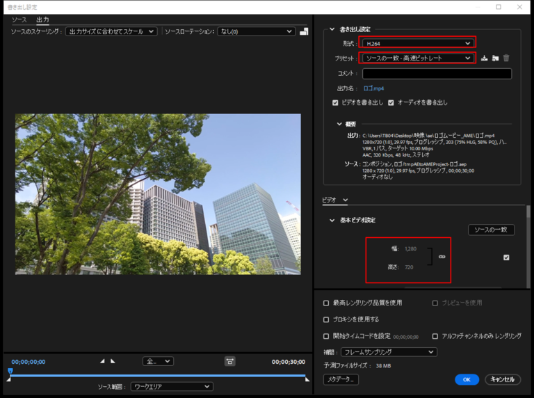 「プリセットのソースの一致」とは、元のメディアの設定(解像度、フレームレート、アスペクト比など)に基づいて出力設定を自動的に調整する機能です。これにより、元のビデオの品質や設定を維持したまま最適なエンコード設定でエクスポートすることができます。 - 基本ビデオ設定 出力の幅・高さを確認します。