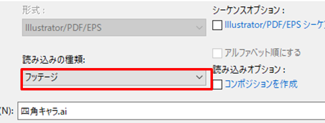 今回はレイヤー要素を持たないオブジェクトとして扱うため、読み込みの種類は「フッテージ」を選択します。