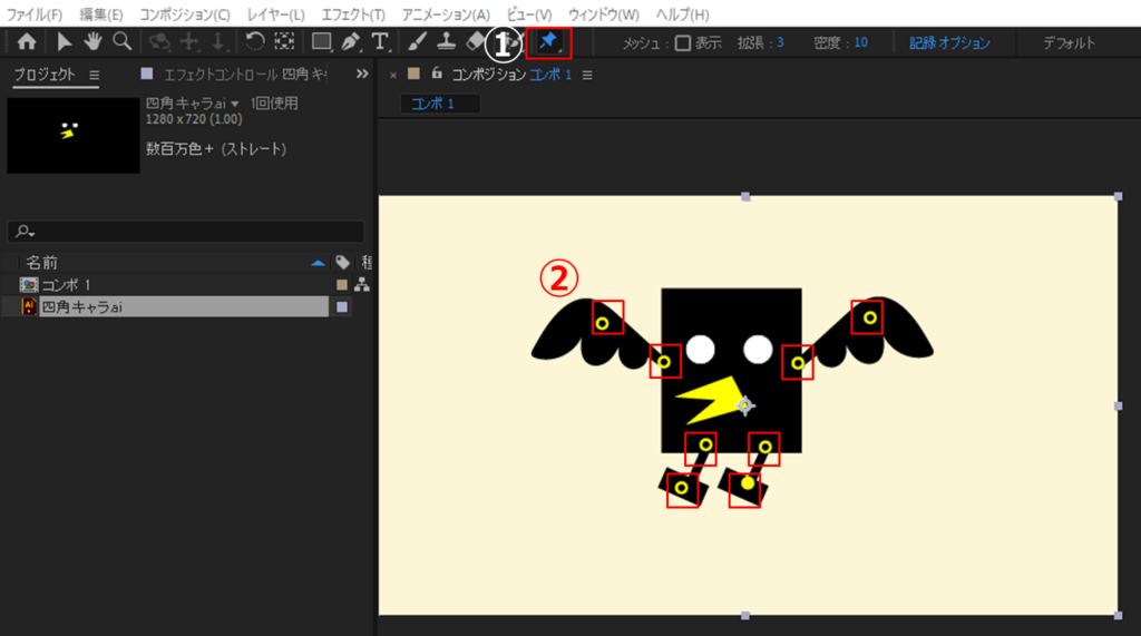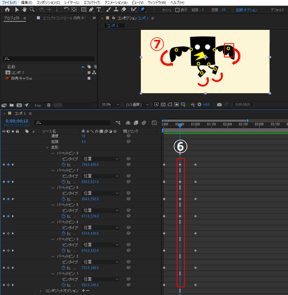 After Effectsでは、このピンの位置を時間ごとに変化させることで、キャラクターのアニメーションを作っていきます。