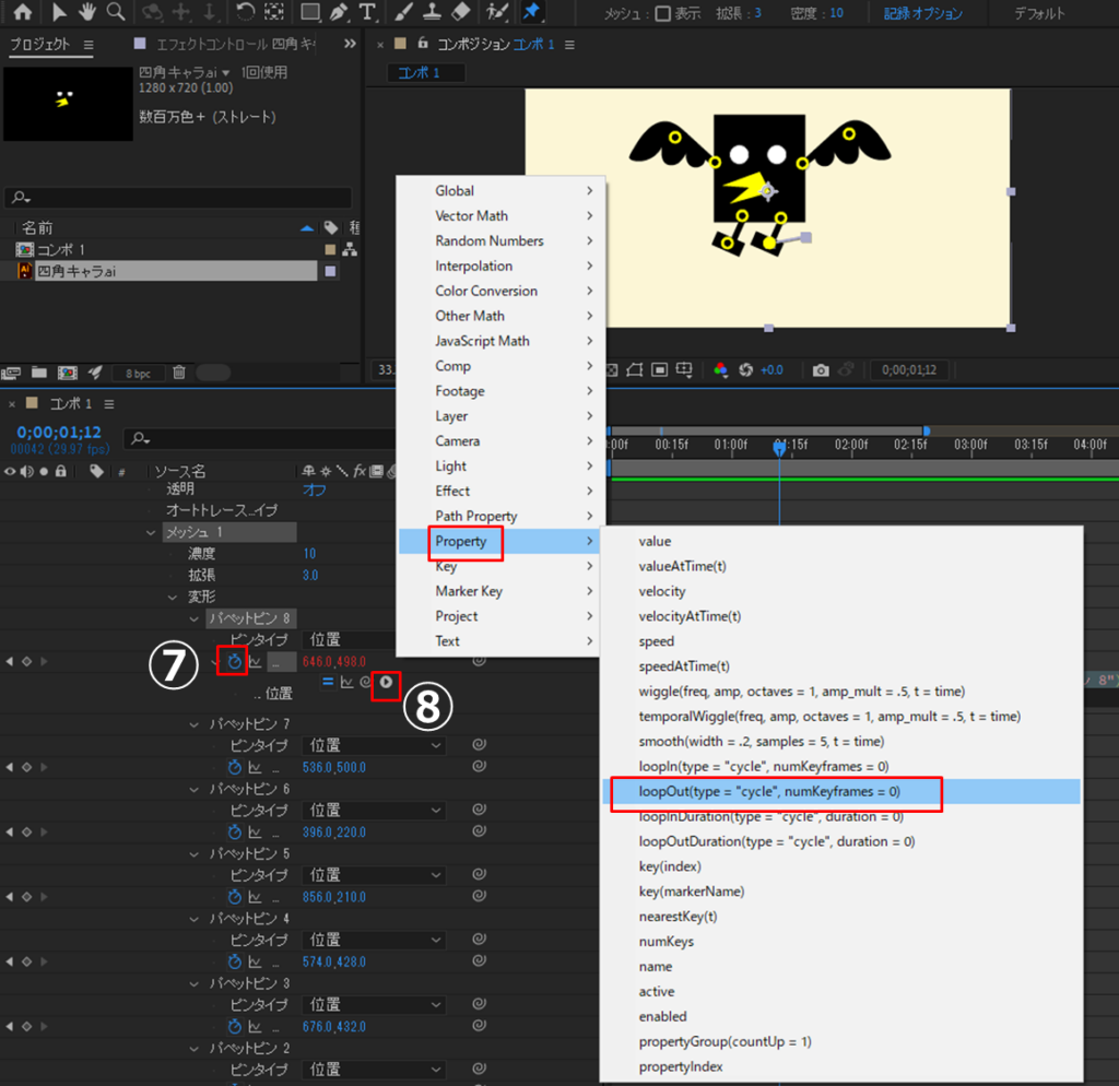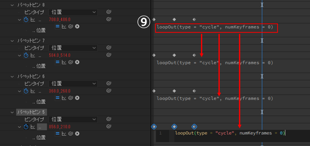 ⑧[エクスプレッション言語メニュー(再生マーク)]→[Propety]→[loopOut(type=”cycle”,numKeyframes=0)]を選択すると繰り返しになります。