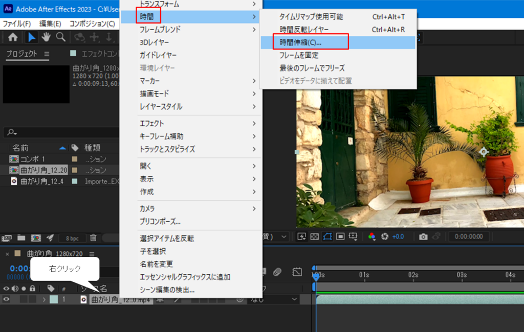 ①対象のクリップ上で右クリックをし、[時間]→[時間伸縮]を選択します。