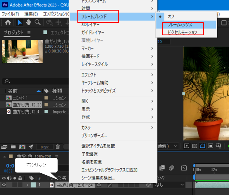 対象のクリップ上で右クリックをし、[フレームブレンド]から[フレームミックス]または[ピクセルモーション]を選択