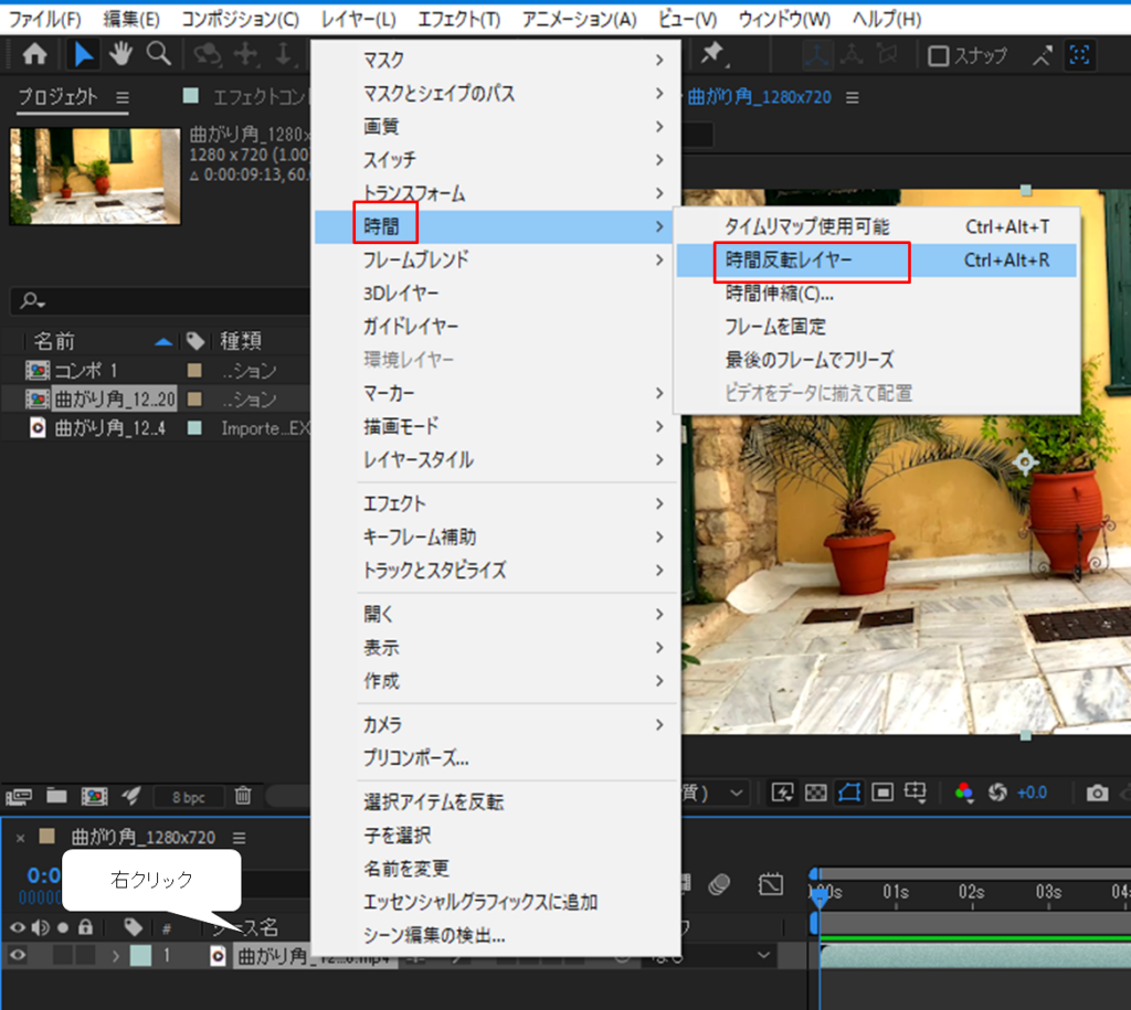 対象のクリップ上で右クリックをし、[時間]→[時間反転レイヤー]を選択します。