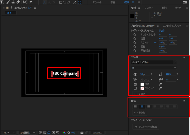 After Effectsでは、文字を入力するだけでなく、フォントやサイズ、色、配置なども細かく設定できます。テキストの見た目を整えることで、映像全体の印象が大きく変わるため、文字編集は非常に重要な作業です。