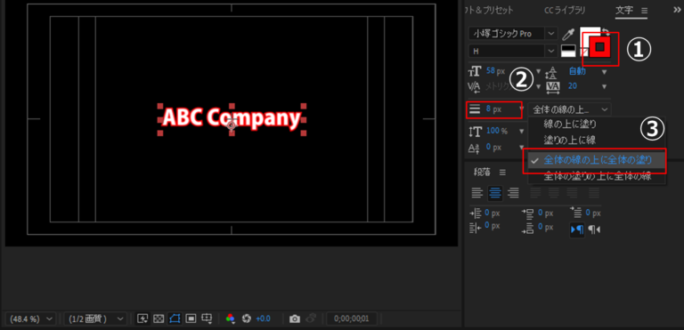 ③[塗りつぶしの上にストロークというプルダウンメニュー]→[全体の線の上に全体の塗り]を選択します。これにより、文字の一文字それぞれに縁ができるのではなく、文字全体に縁ができます。