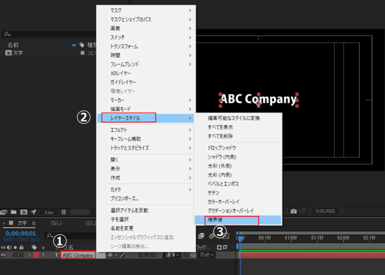 ②[レイヤー]→[レイヤースタイル]→③[境界線]を選択します。