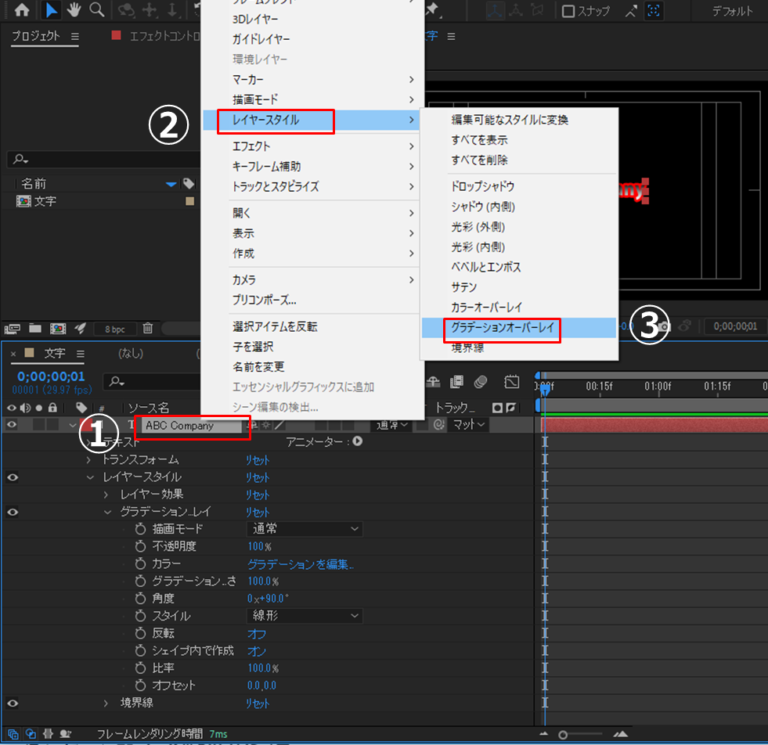 ②[レイヤー]→[レイヤースタイル]→③[グラデーションオーバーレイ]を選択します。