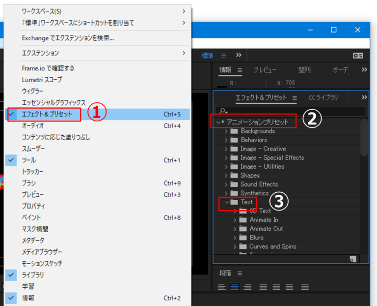 ②[アニメーションプリセット]→[Text]を選択します。