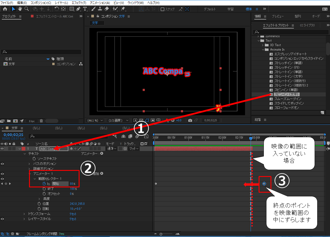 ①[Animat In]を文字レイヤーにドラッグします。