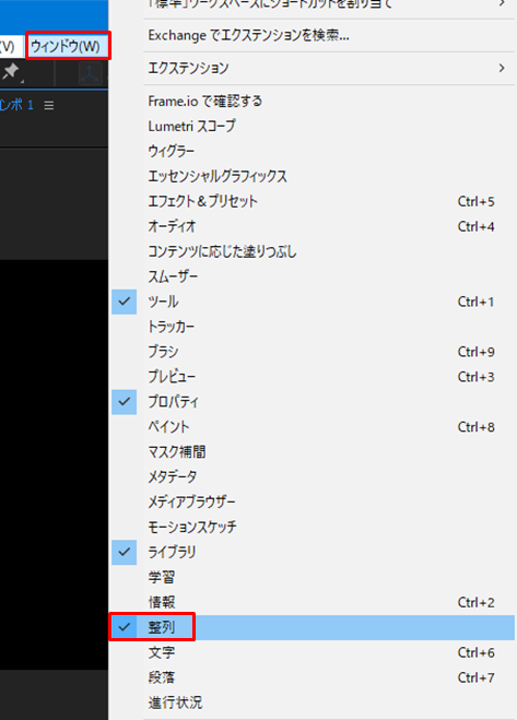 また、必要に応じて[ウィンドウ]メニューから文字パネルや段落パネルを表示し、個別に設定することもできます。After Effectsに慣れてくると、これらのパネルを使い分けながら細かな文字調整をしていく場面が増えてきます。
