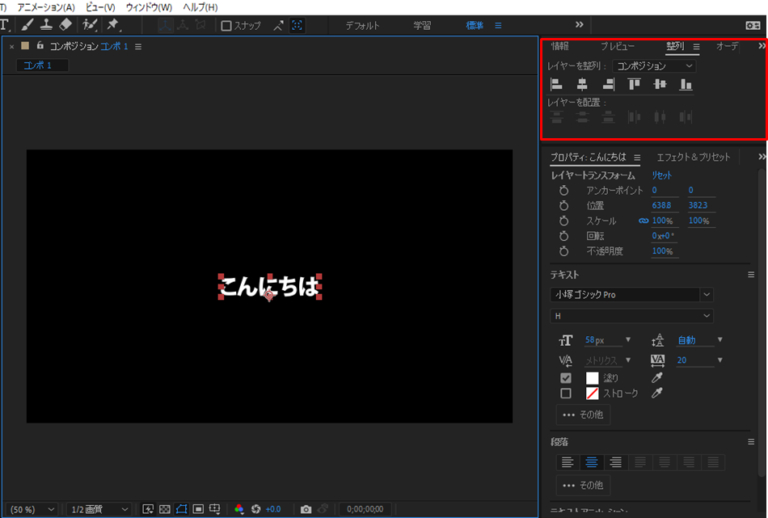 After Effectsでは、文字ツールを使うことで簡単にテキストを入力でき、さらにテキストパネルや段落パネルを使って、フォント・サイズ・色・行間・配置などを細かく編集できます。整列パネルを使えば、画面内に正確に配置することも可能です。