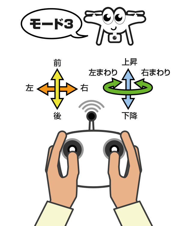 世界で一番使用されているモードです。実際の飛行機やヘリコプターの操縦と近いという点でも広く使用されているのがわかります。