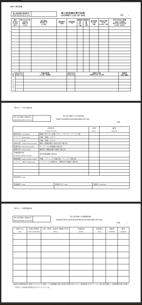 実際に、国交省の「無人航空機の飛行日誌の取扱要領」には、飛行記録・日常点検記録・点検整備記録の様式が掲載されています。