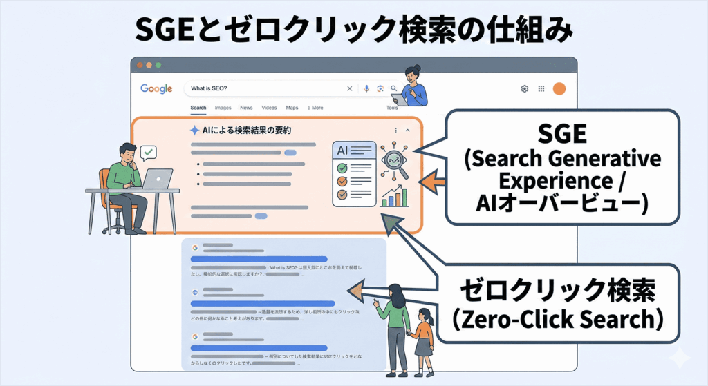 これは、検索結果の一番上にAIが「要約した答え」を即座に表示する機能です。「SEOとは」のような単純な用語検索なら、ユーザーはAIの回答だけを見て満足し、サイトをクリックせずに帰ってしまいます(これをゼロクリック検索と呼びます)。