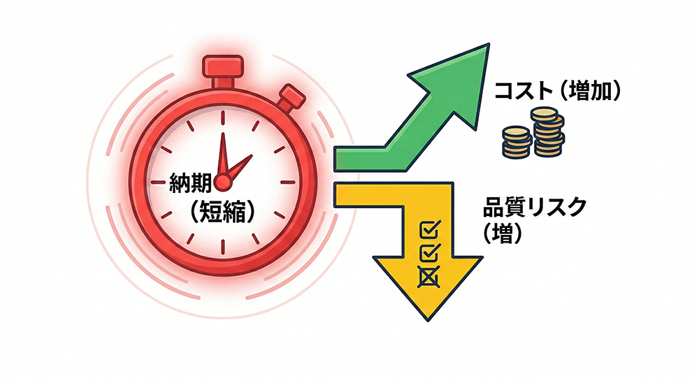 通常の工程を圧縮するためには、特急対応としての「追加コスト」を投入するか、検証期間などを省略して「品質リスク」を許容するという代償が伴います。