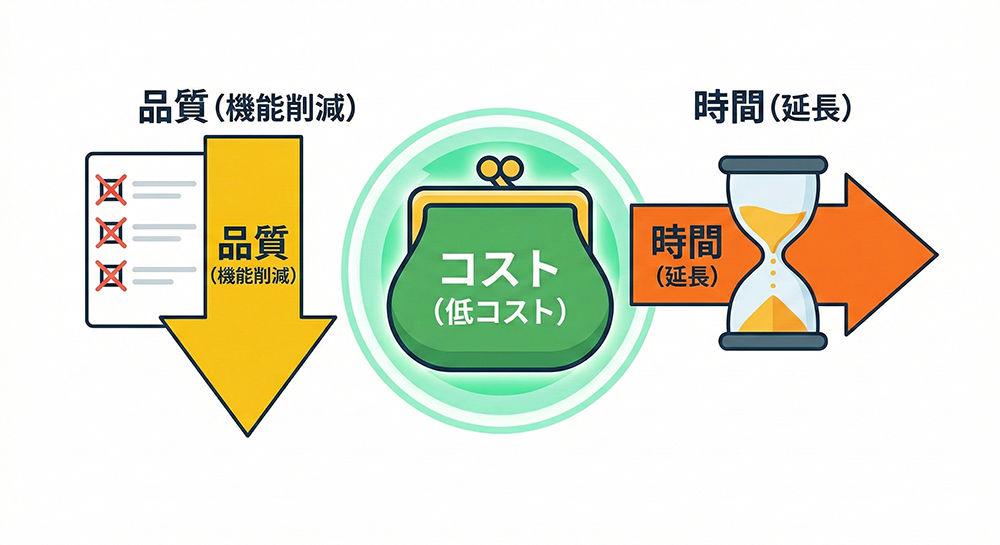 機能追加やクオリティ向上を求めれば、作業量は物理的に増加します。その対価として、完了までの「時間(納期)」が延びるか、リソースを確保するための「予算(コスト)」が必要になります。