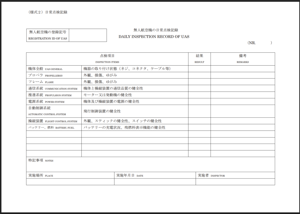 この記事は、ドローン飛行日誌に必要な「3つの記録」のうちの2つ目、「日常点検記録」を作成するツールです。